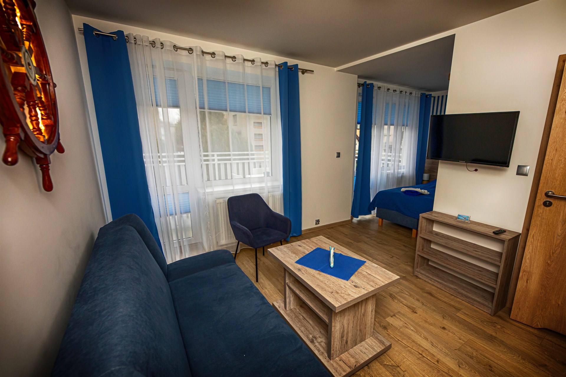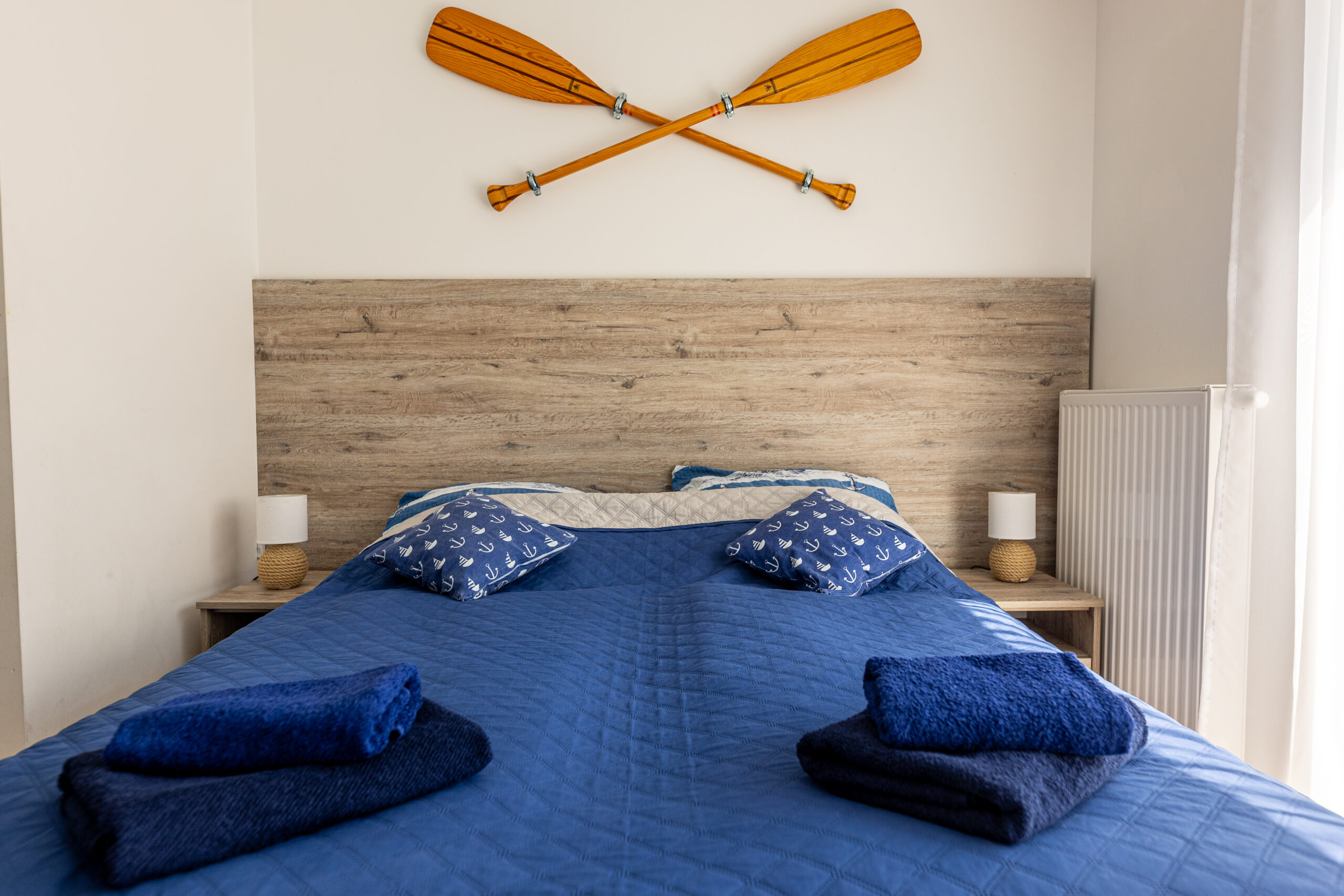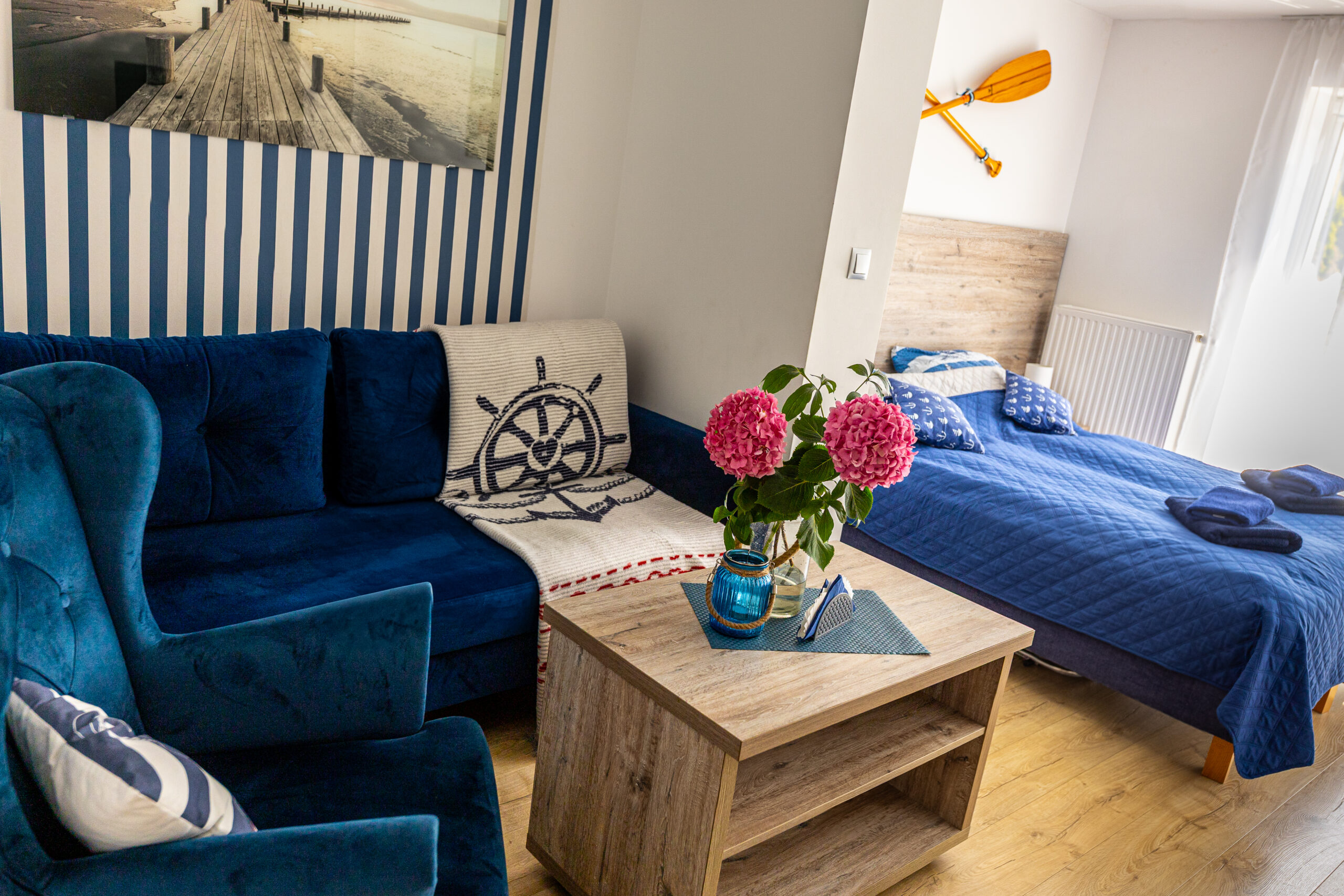 Nasze pokoje Deluxe Plus to przestronne wnętrza w marynistycznym stylu, które wprowadzają w prawdziwie nadmorski klimat i zapewniają komfortowy wypoczynek. To idealny wybór dla osób ceniących przestrzeń, wygodę i swobodę. Każdy pokój posiada własną łazienkę oraz bezpośrednie wyjście na ogród, taras lub balkon, dzięki czemu można rozpocząć dzień od chwili relaksu na świeżym powietrzu.